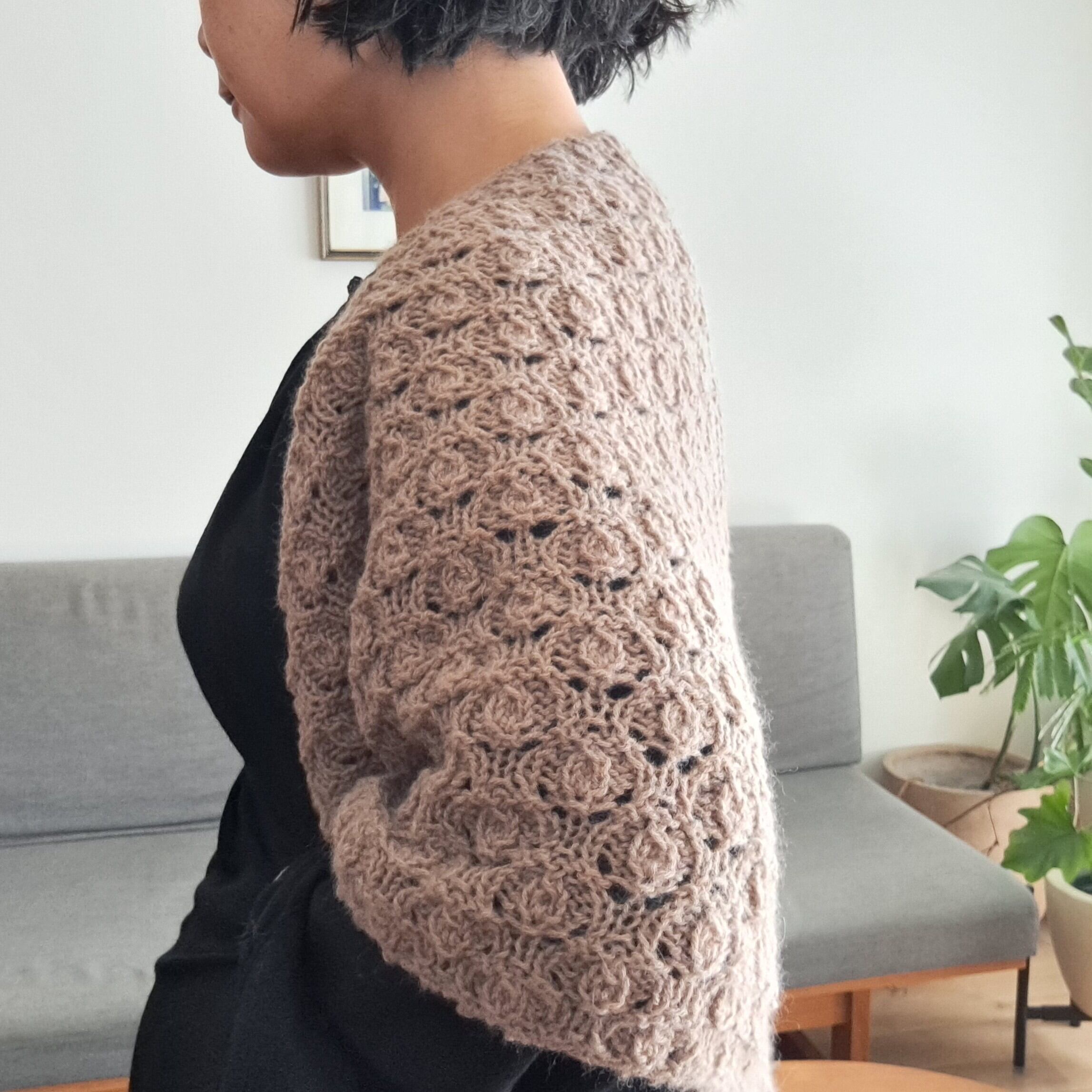 茶色みのあるベージュです。ニュアンスがありとてもいい色味です!アルパカ入りの糸は軽くて柔らかくモコモコしすぎず、使いやすくてお気に入りです。