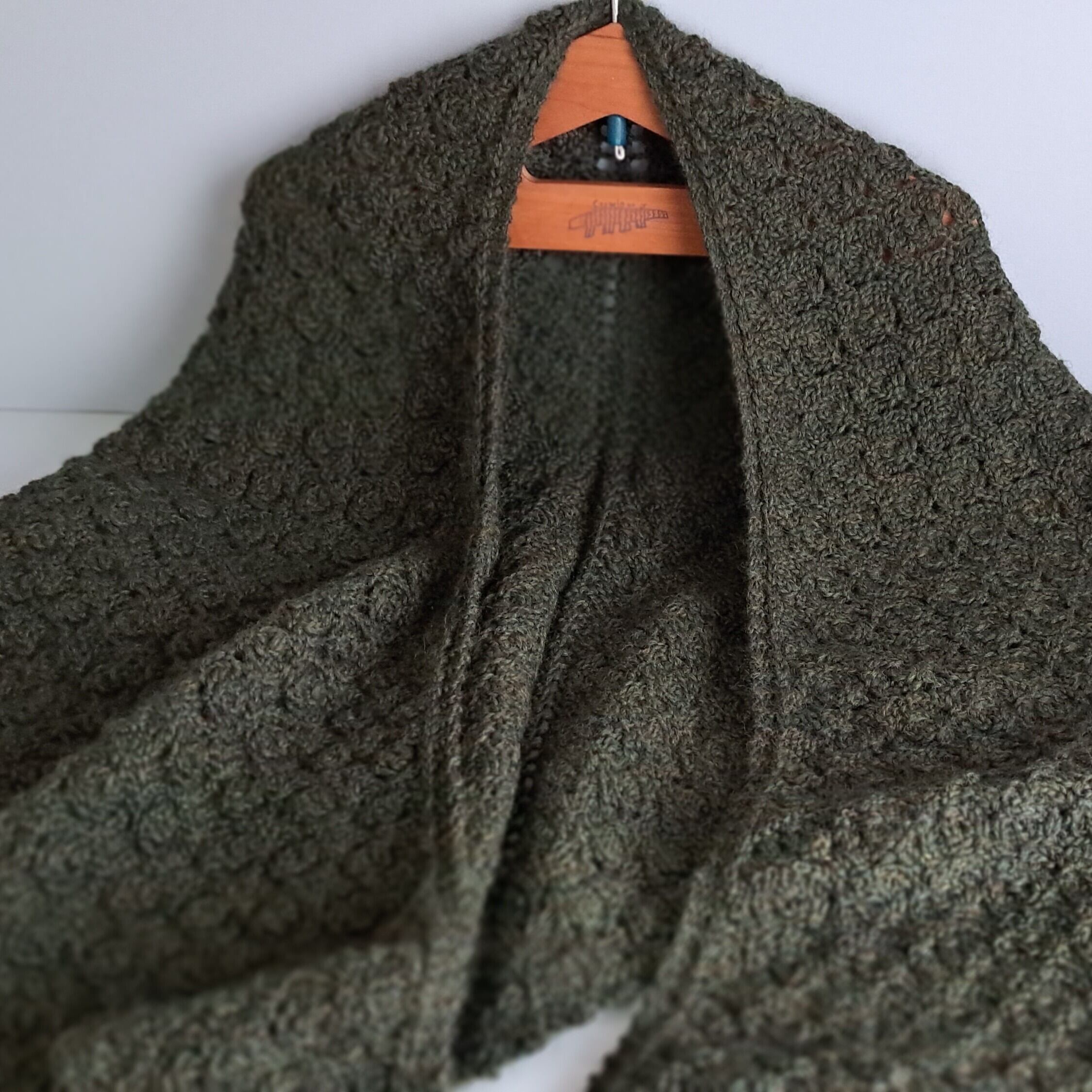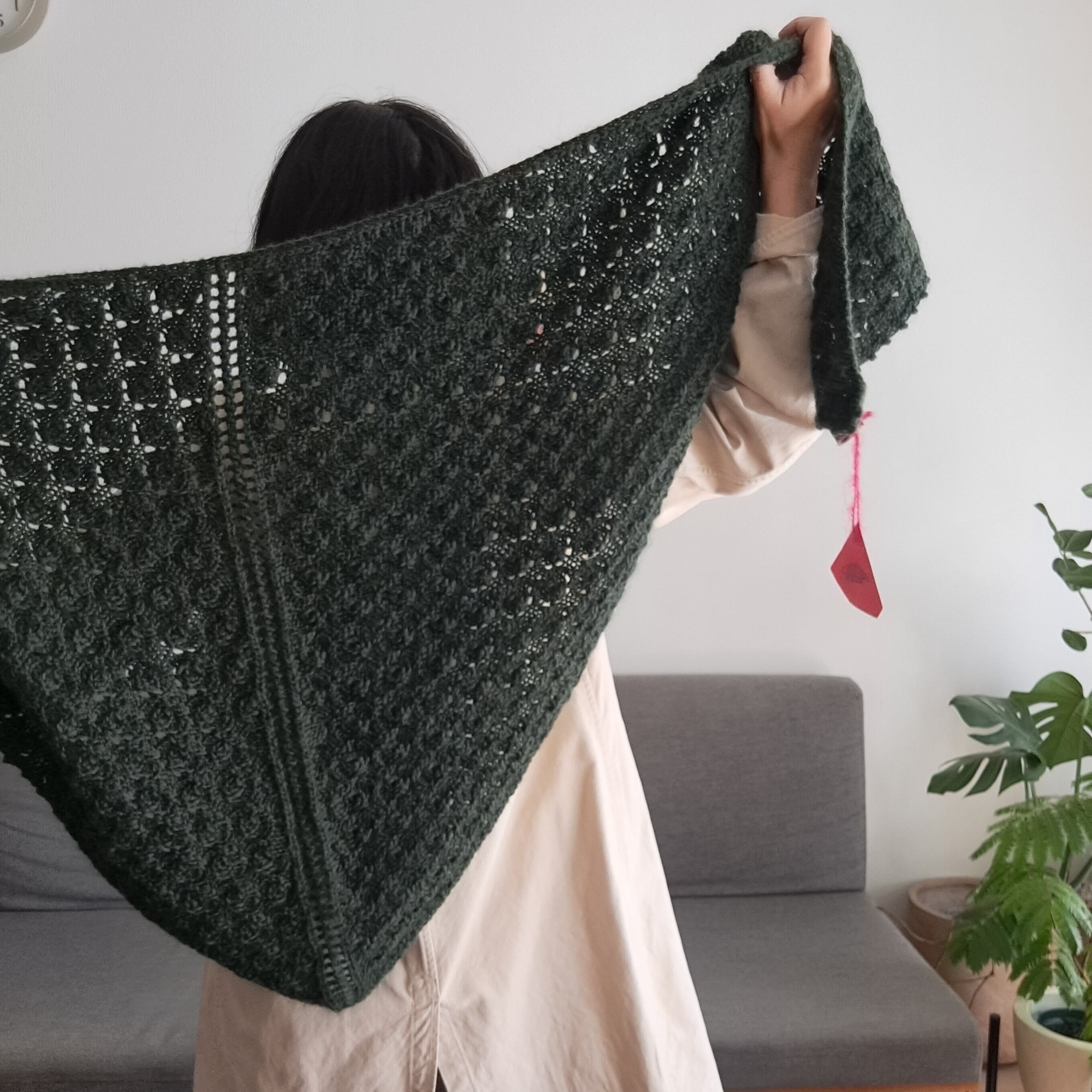 長方形にしたり、三角のショールにしたりと、色、素材を変えて編み続けています。