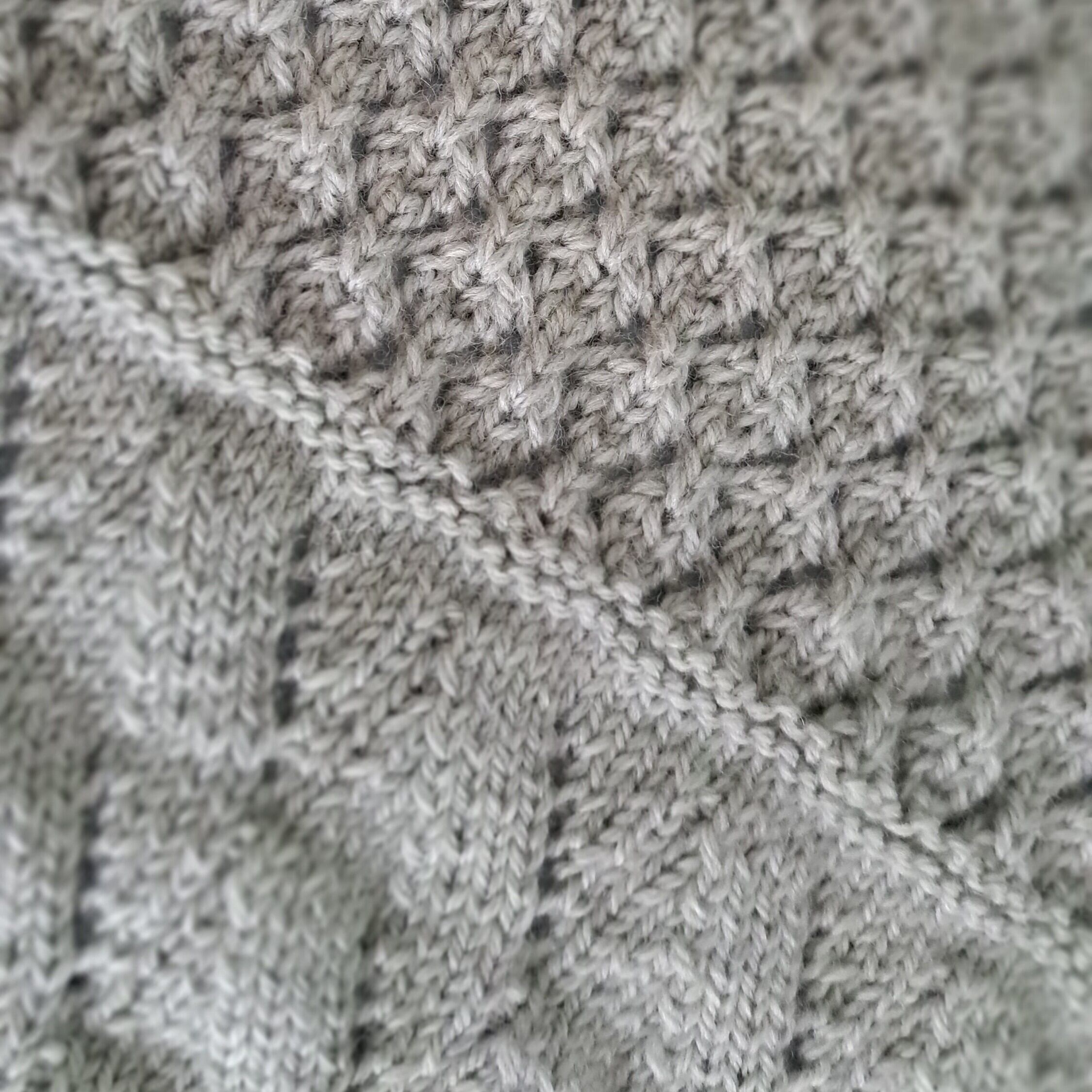 縁は、なみなみになるような柄。続けて葉っぱのような柄。この二柄が大きな縁になってて、その上に細かいダイヤみたいな透かし模様を編み込みました。