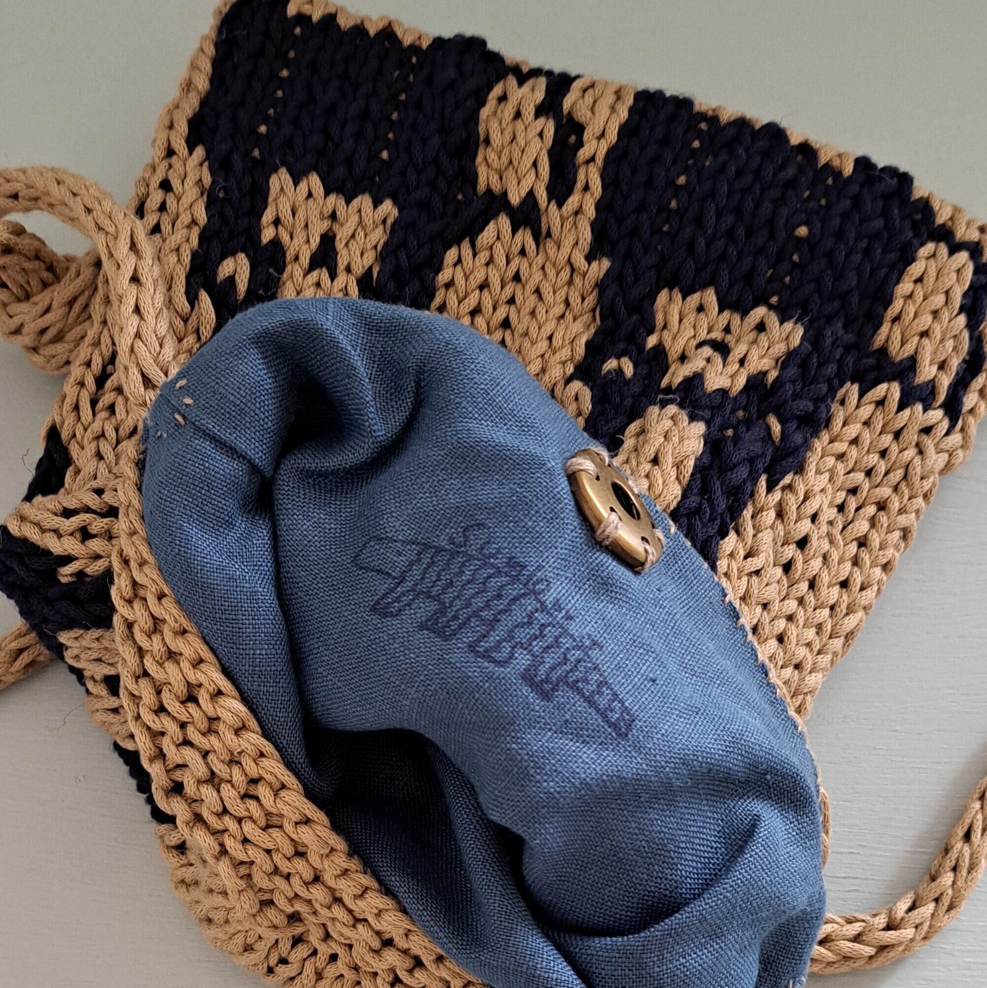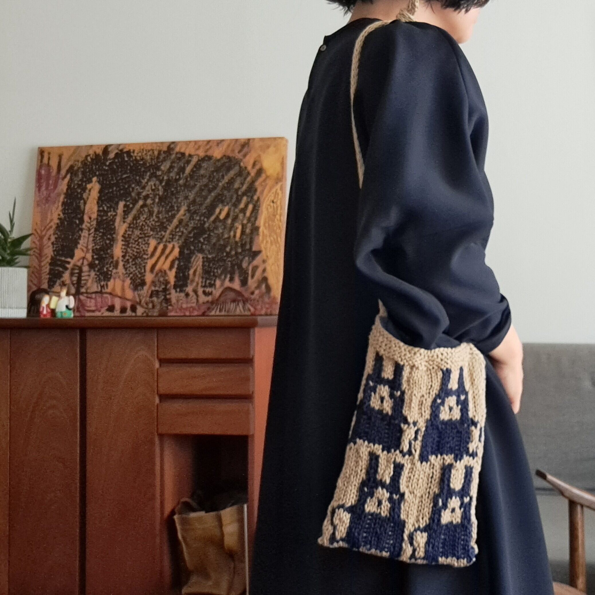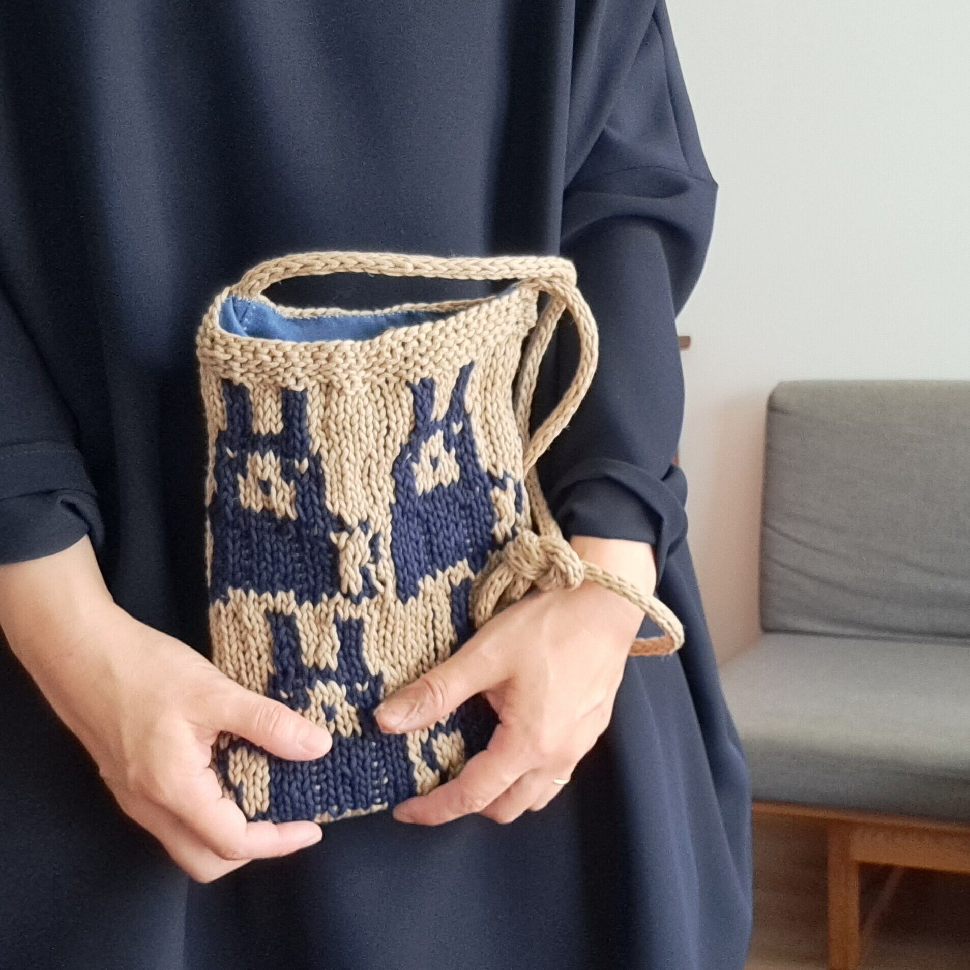 編み込みポシェット うさぎ ベージュ×ネイビー
