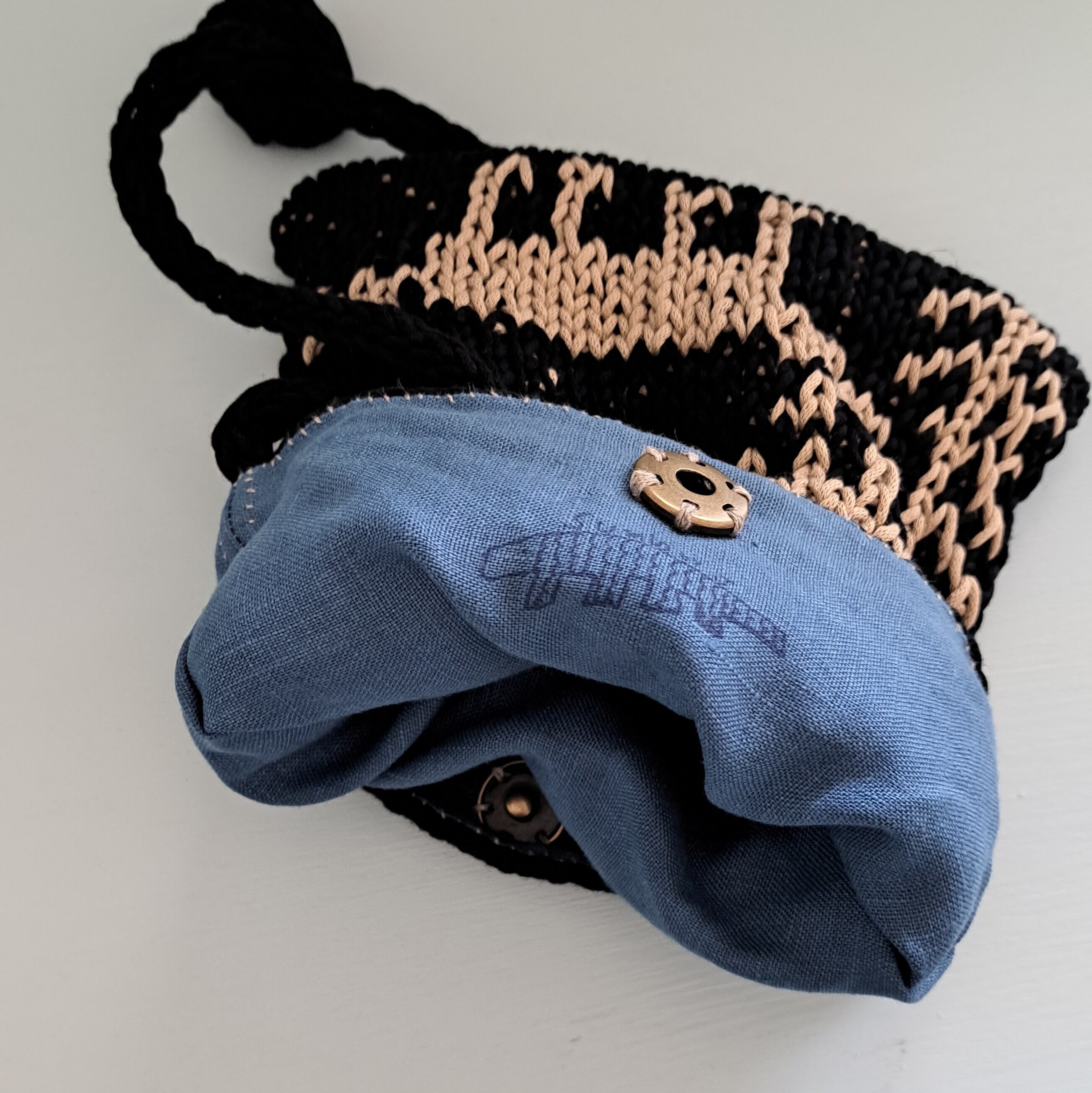 ジュート(黄麻)をコットンの糸でつつんだ素材です。はり、こしのあるしっかりした糸は、編み込むのに力加減が難しくて、何度も作ってみました。