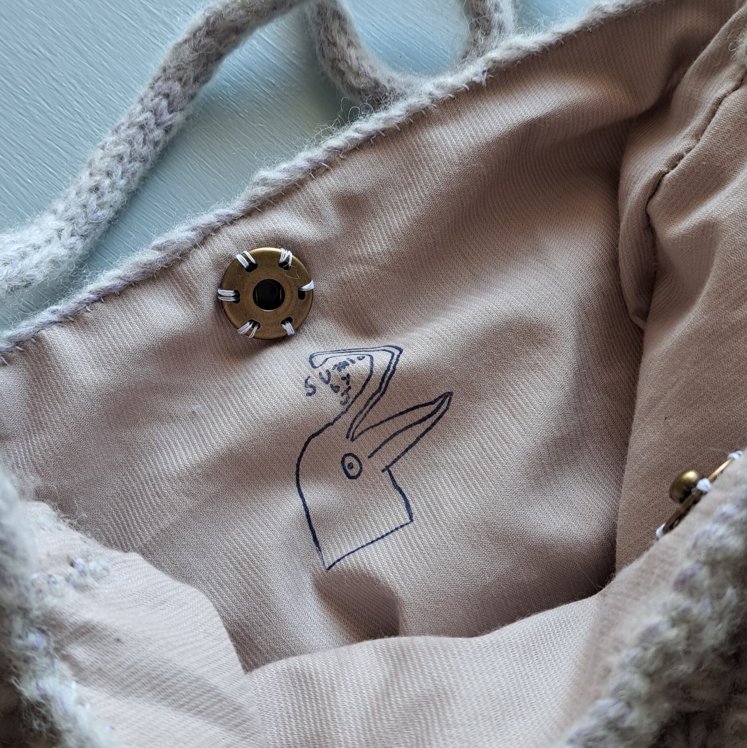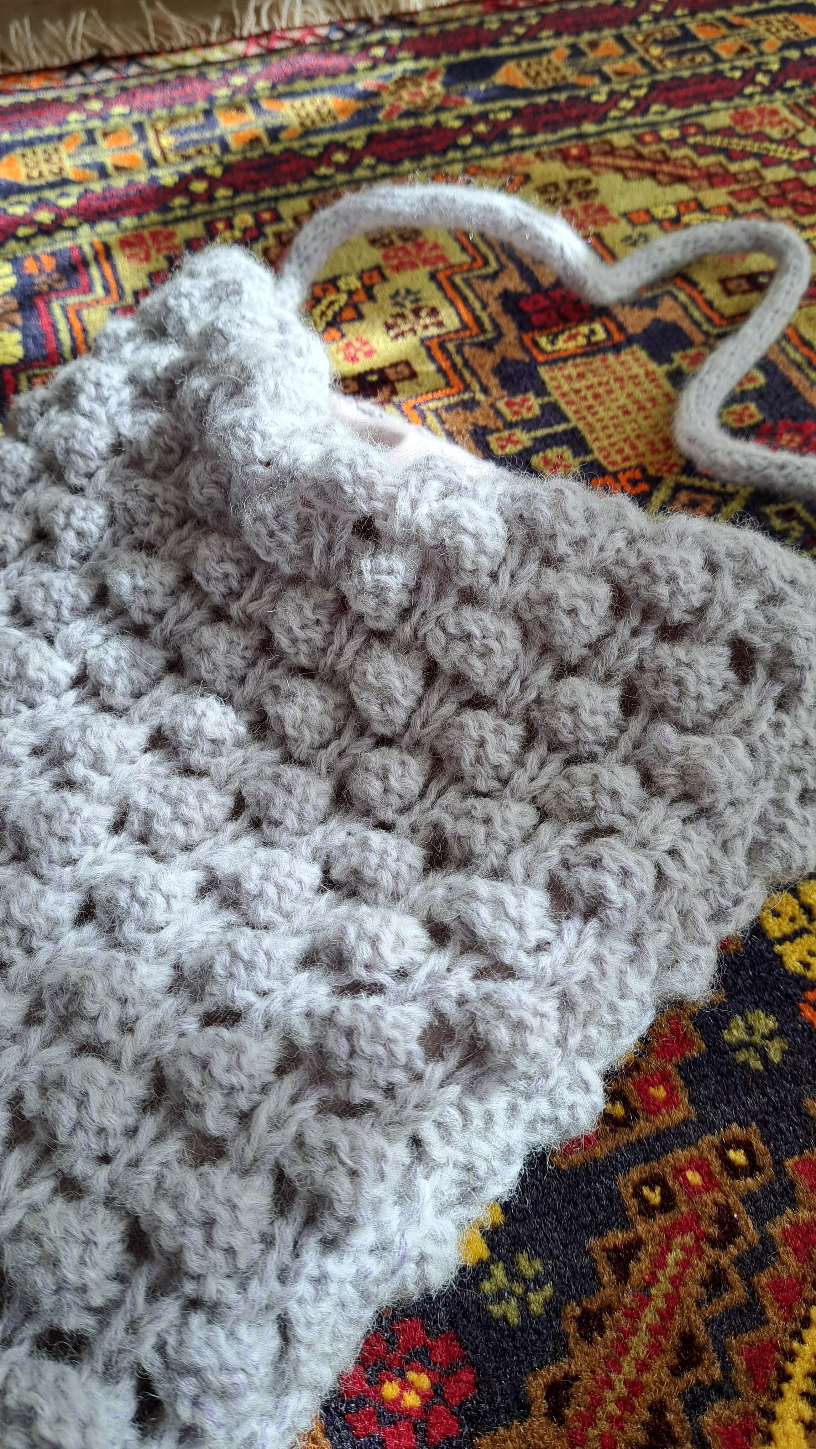 すかすかした編み方で、中袋もしっかり見えるので、この糸の雰囲気をこわさないように、同系色にしました。